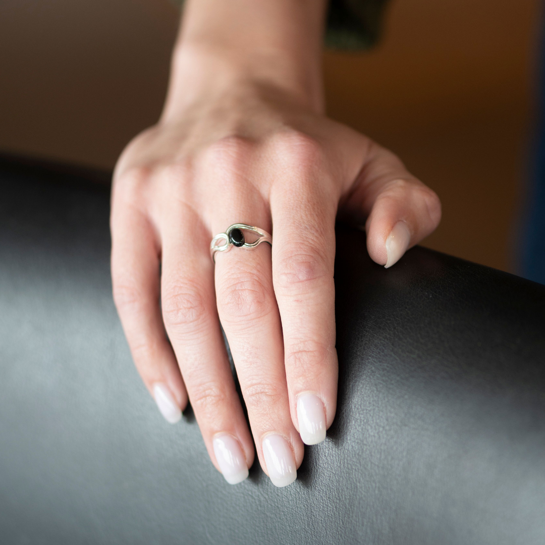 This sunning sterling silver ring showcases an elegant twist design that frames a lustrous black onyx oval stone. Hand-polished to perfection, the onyx creates a sophisticated contrast against the bright silver band. Carefully designed in NZ, this unique piece combines contemporary styling with timeless appeal. Available in four ring sizes to ensure the perfect fit for your hand.