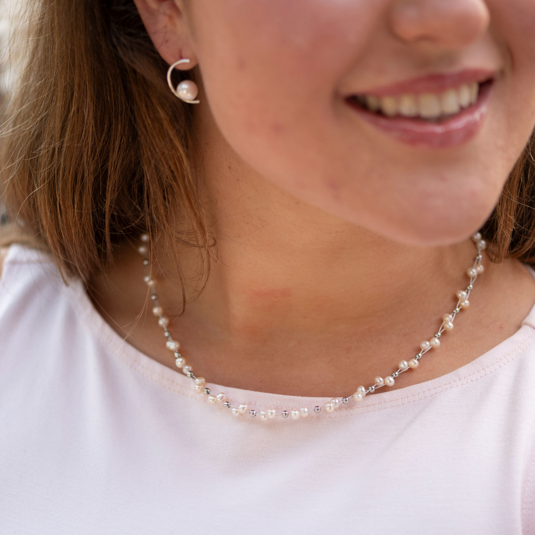 A simply stunning  NZ-designed necklace that celebrates the lustrous beauty of freshwater pearls. Crafted with soft-coated wire, it's feather-light against your skin yet bold enough to make a statement. The delicate layered design moves with you, offering effortless elegance without the weight. The perfect piece for life's special moments.