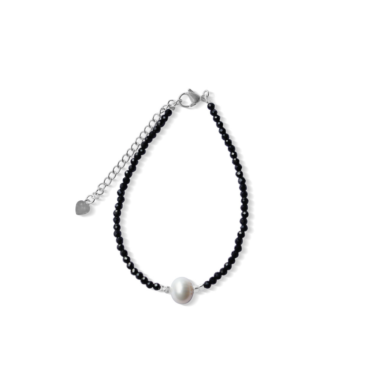 This elegant bracelet combines lustrous black spinel with a luminous white freshwater pearl feature, creating a striking contrast of depth and light. Perfect for layering or wearing as a standalone statement piece, this sophisticated design brings timeless elegance to your jewellery collection.
