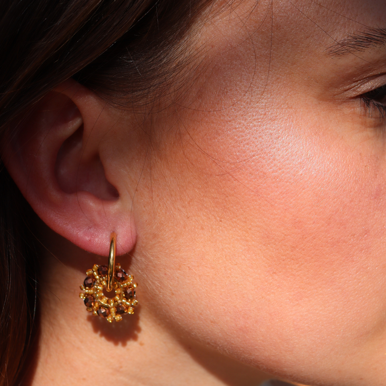 The Steel Me Bronze Earrings showcase a delicate handwoven bronze beaded disc pendant that gracefully moves on a 20mm yellow gold hoop. This elegant combination exudes a classy and chic aesthetic, making these earrings the perfect refined accessory to elevate your summer style.