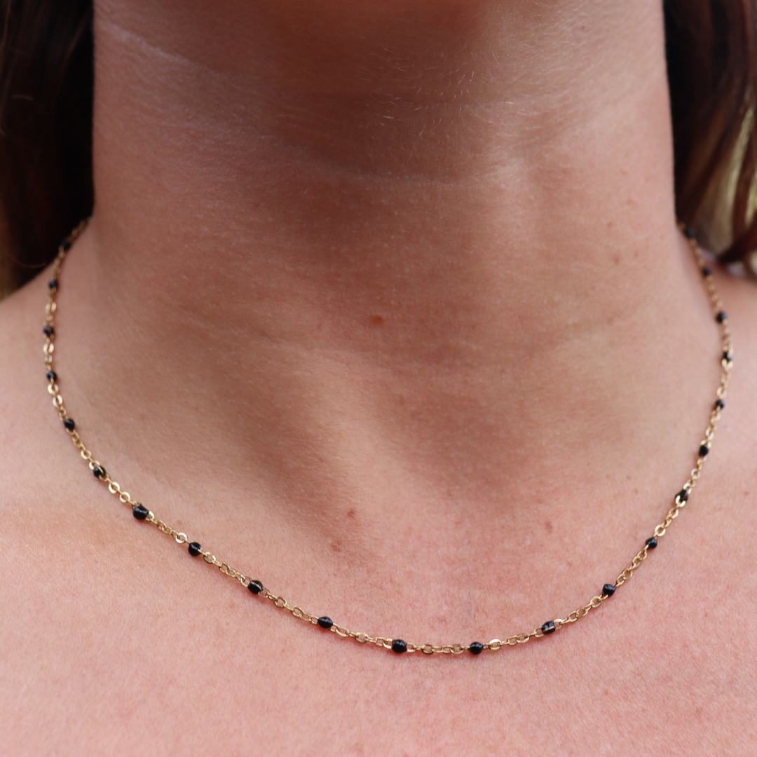 Introduce refined elegance to your jewellery collection with the Steel Me Black Bead Petite Necklace. Crafted from premium stainless steel and accented with a striking black beads, this 40cm piece strikes the perfect balance between understated and impactful. The thoughtfully added 5cm extender chain offers flexibility for various styling preferences, whether you favour layered looks or a single chain.